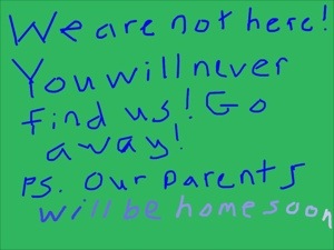 I stood outside the front door of the miserable stationary house, faux wood door staring me in the face with its sign placed at a shallow height that made me wonder if its words were intended to be read by a man’s navel. It was makeshift, could hardly be called a sign, really – scrawled by a childish hand with marker of blue, which appeared to drain itself of ink as it progressed down the green page of craft paper, like the marker had sputtered the last of its artistic life, sacrificing its final breaths for the sake of that stupid sign, or the sign maker wrote the text vertically, after the paper had been taped up, skewed to the right, suspended by two overlong strips of invisible tape.