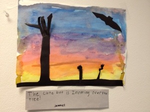 I keep this art piece above the computer in my office at work, so I catch sight of it regularly throughout the day. My heart tends to race a bit every time I glance at it, and I’m not sure why. I love this picture. My oldest son created it, and it is a grand masterpiece in my eyes. I love it because it tells a story beyond the simple phrase attached. The cute bat is not just flying, not just gliding – he is not out for a mundane, evening bat stroll – he is zooming. To me, this is a picture story that carries all the elements. Perhaps that’s why I get a little anxious when I view it. My son made it. My son, the storyteller.