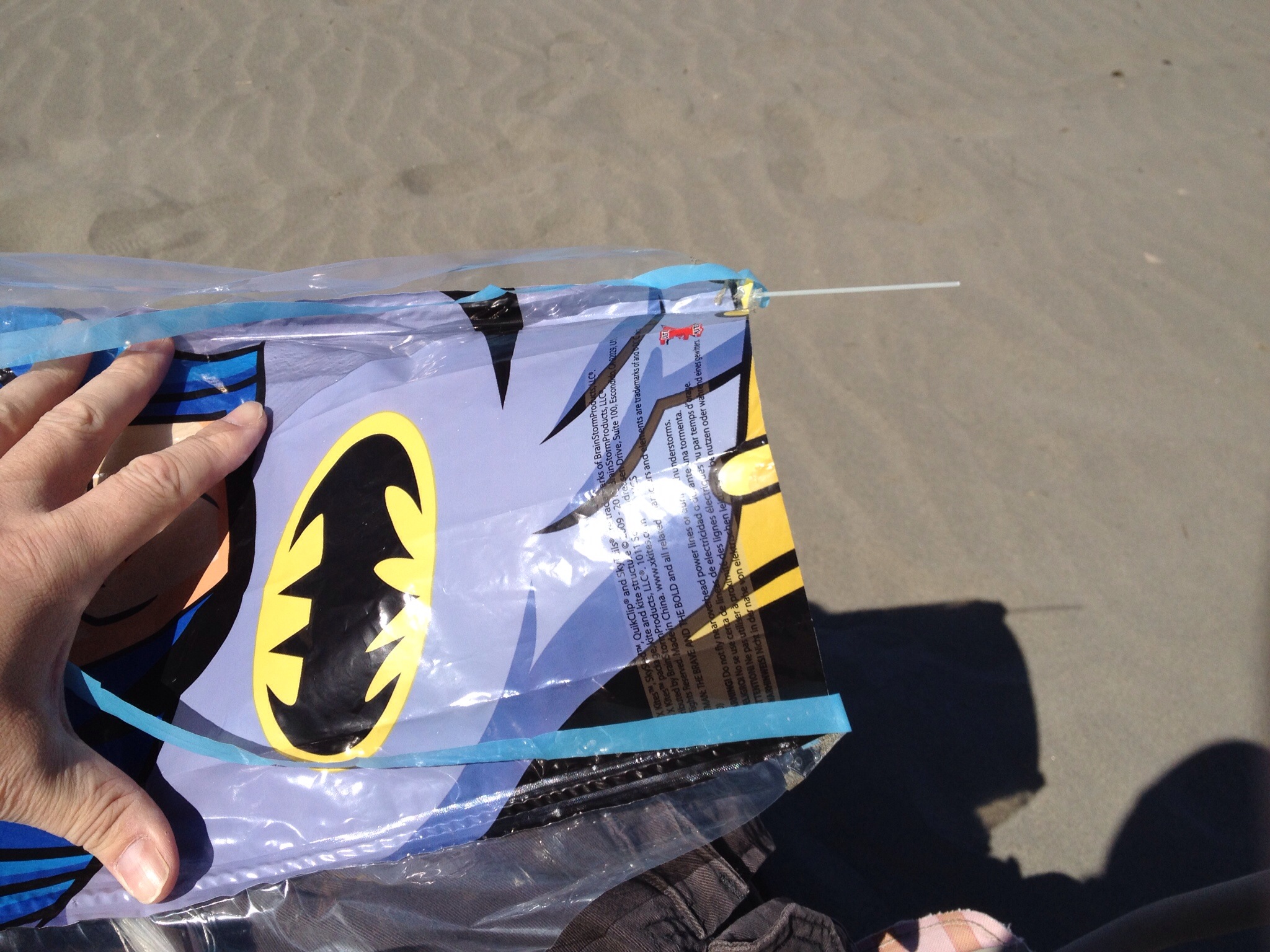 Dollar store kites aren’t made of much – a thin sheet of plastic, a couple fiber rods, and some invisible tape – four strips of tape, to be exact. It was the failure of one of these strips of tape that kept Batman grounded. I took quick mental inventory of materials at my disposal – some beach towels, camera, sand toys, folding chairs, sunglasses, flip-flops…no tape. Of all the cargo we’d lugged to the beach, there was nothing that resembled tape – nothing sticky. Only one choice remained – I was forced to attempt an invisible tape transplant.