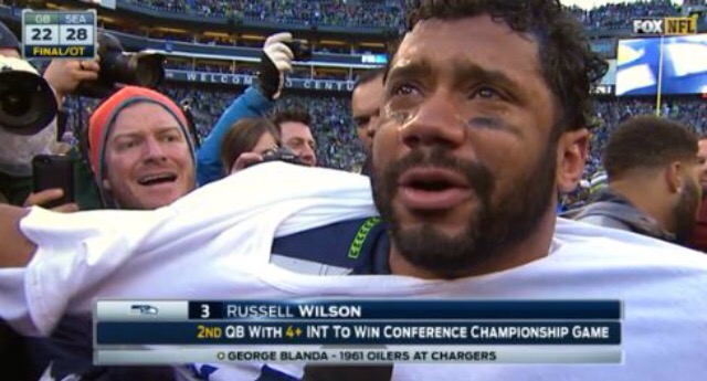 There were so many thrilling moments in Seattle’s NFC championship, but my favorite moment came minutes after the game, when Russell Wilson was overcome with emotion during the post-game interview. Without a doubt, he had played the worst game of his life, but he managed to finish with eight of the best minutes in his career. I don’t believe his tears were born out of God exercising his will for a Seahawks victory. His emotion was far too visceral for such an abstract idea. I believe he was crying because of his teammates – the fifty-one guys who continued to believe in him, despite the stinker he’d put together for most of the game. His tears came from love. I choose to believe God saw Russell’s outpouring and thought it was beautiful. I don’t know if that makes Him a football fan, but I do believe He’s a big fan of each of us.
