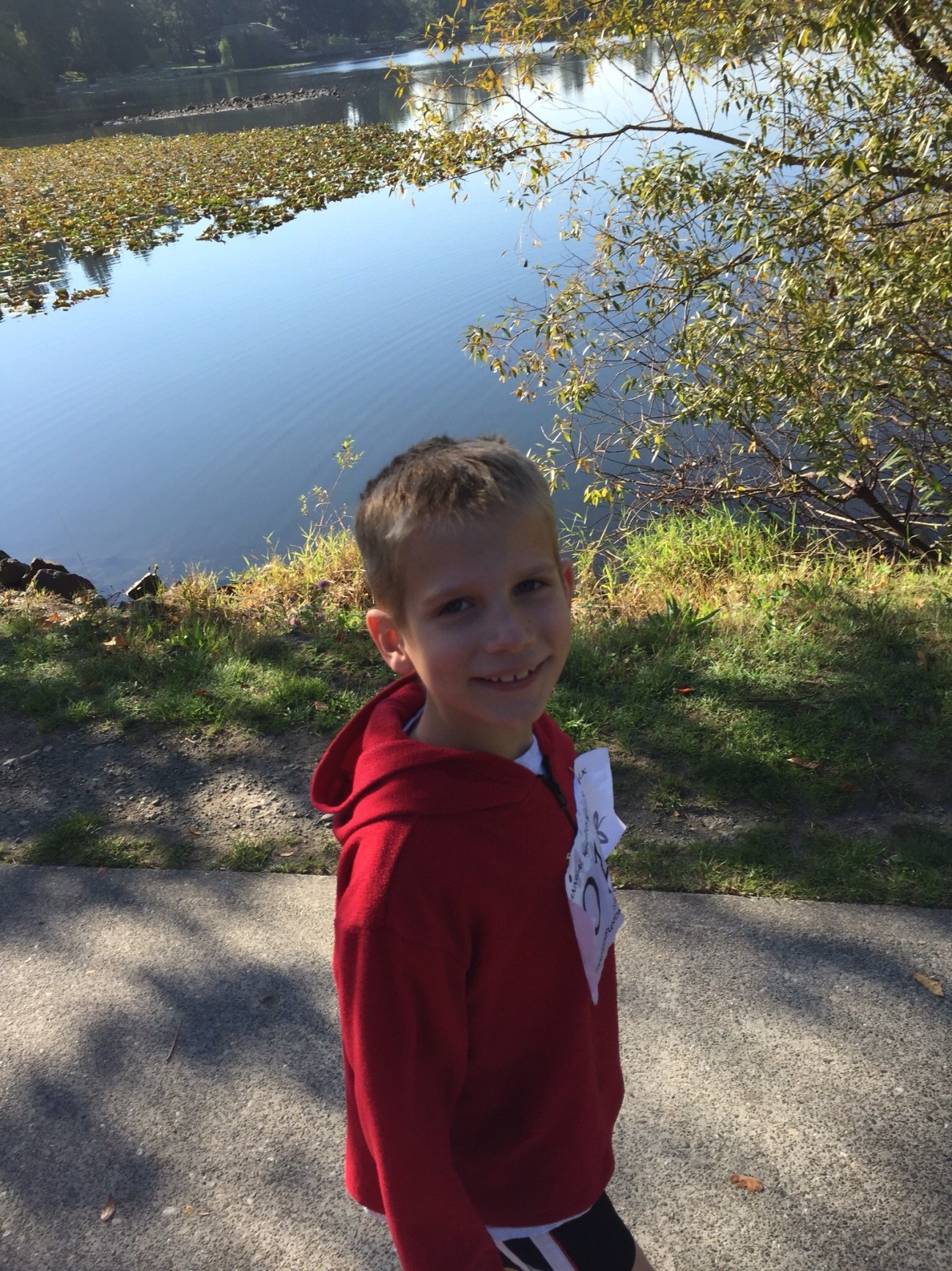 “Oh,” he says. He stands, peering up at me – the foreground to a mental portrait I know will haunt me all my days – the swampy lake with its ducks and turtles and lily pads, odor of algae, sacrificial star piercing crystal blue, and my boy, weary and wet. Strong.