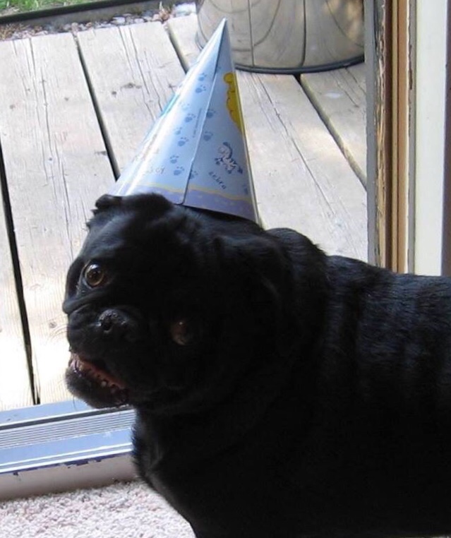 I heard grunting sounds from the seat beside me. Tom Sawyer was sniffing his birthday candle, perhaps wondering how to make it go out. He sniffed too hard and got some smoke up his nose, which made him sneeze all over the cake. I think it must have been his slobber that put out the flame. I watched as his cake became a big bowl of butterscotch ripple ice cream. His favorite. It occurred to me then that I could have spared myself this whole experience and just given him a carton of ice cream for his birthday. Like all pugs, Tom Sawyer has bulgy eyes, but in that moment his eyes grew so big I thought they’d fall right out of his head. He buried his face in the bowl, lapping with his long tongue, splattering ice cream all over his dome-shaped head.