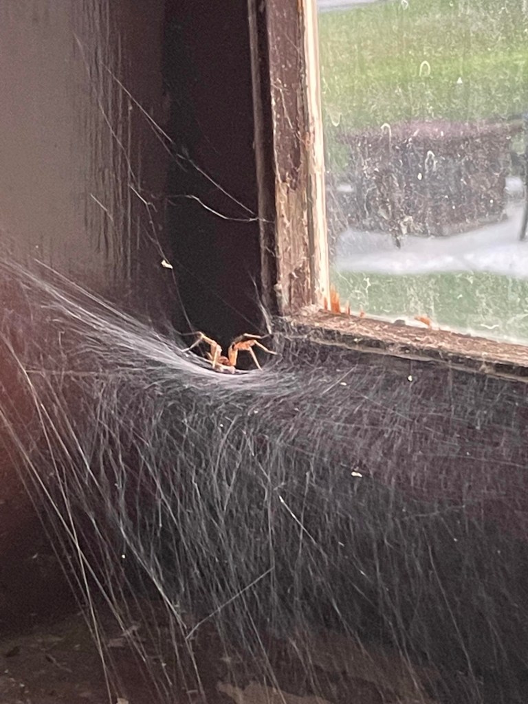 Simple, brown and harmless, a common brown house spider which had managed to remain healthy and secluded in its garage abode, two feet above the creaky articulating door.